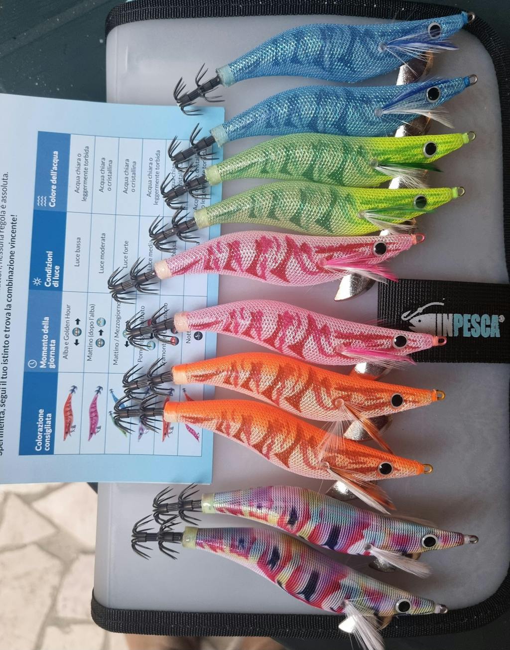 Un Kit completo che comprende il nostro astuccio INPESCA in omaggio che contiene 10 egi Sukitōru: 2 per ogni colore.